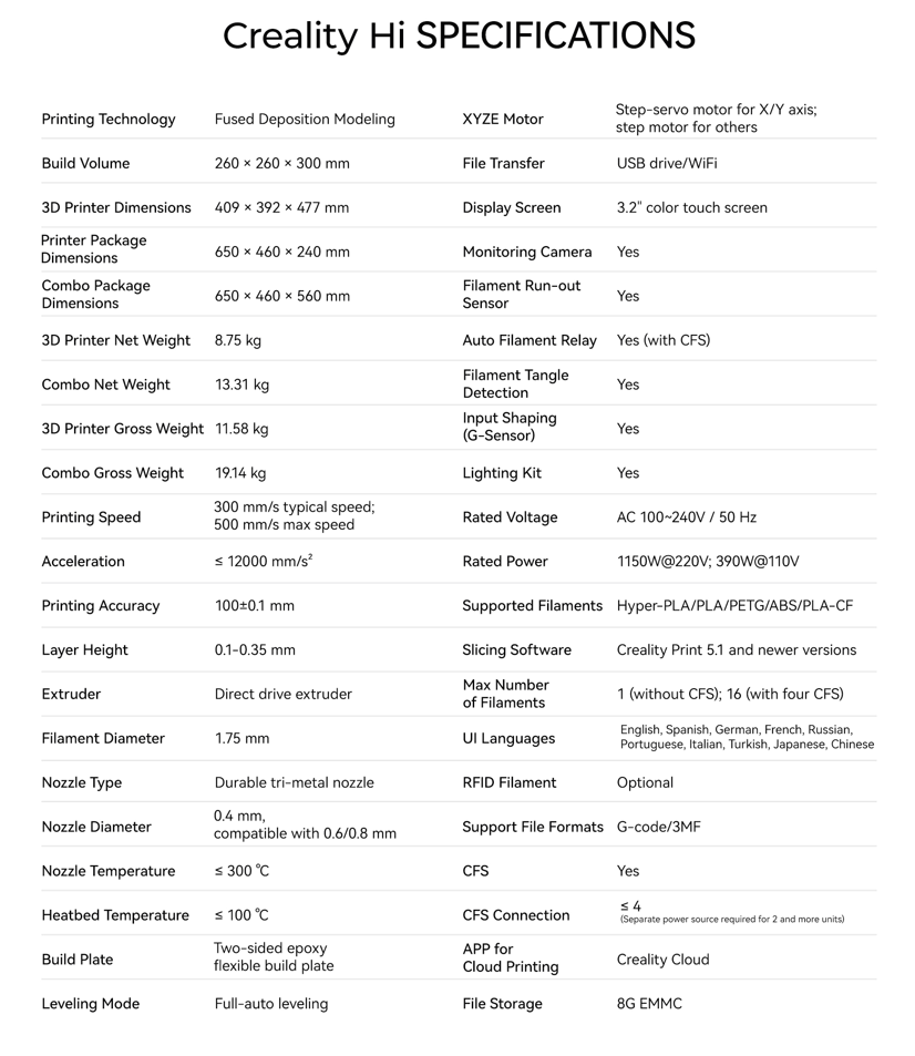 - Fast Print Speed: 500 mm/s max speed; 12000 mm/s² max acceleration.